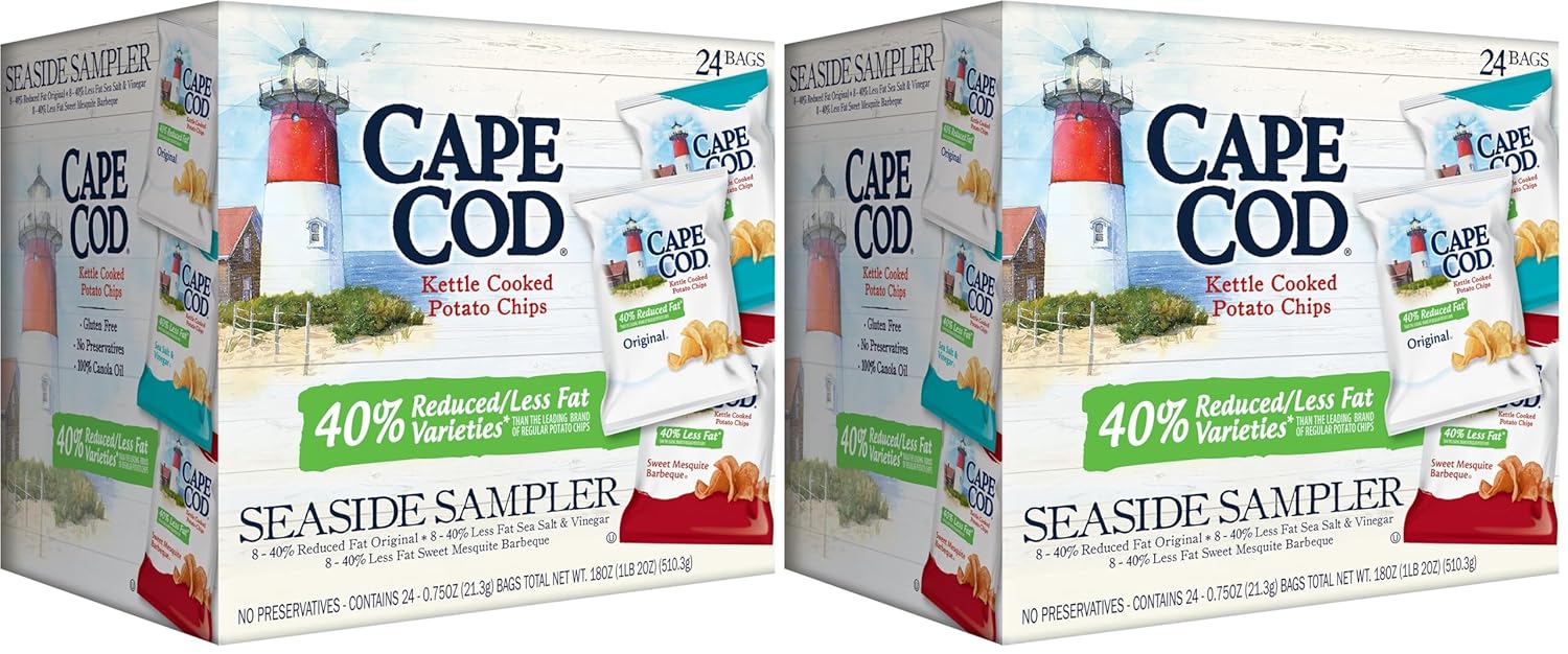 Product Description Cape Cod kettle chips seaside sampler contains 24 single serve bags of our best selling reduced fat flavors (original, sweet mesquite barbeque, sea salt & vinegar) for on-the-go and lunch packs. Cape Cod chips are the home of ridiculously good chips. From the Manufacturer Your favorite kettle cooked potato chip flavors in single serve snack bags. Perfect when you want a tasty, crunchy snack on the go. These potato chips taste remarkably similar to our regular chips. We begin with simple ingredients like choice potatoes and vegetable oil and finish by removing excess oil during our unique kettle cooking process to reduce the fat. So expect great taste, and delight in a reduced fat snack. Cape Cod Potato Chips are known for their quality taste, hearty crunch and distinctly remarkable flavor. These delicious chips are made with carefully selected ingredients. Available in many traditional and unique varieties,