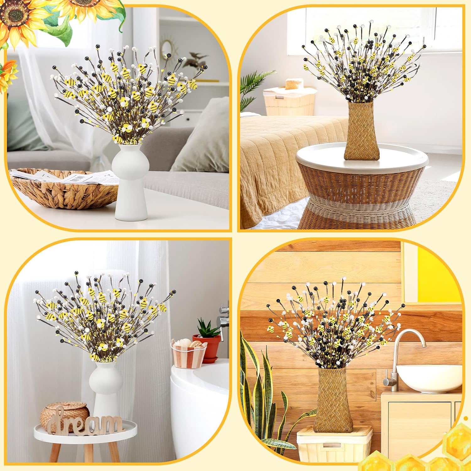 Features: Whether placed in a vase, scattered on tables, or added to summer arrangements, these picks serve as versatile vase fillers. Their double-sided design ensures that the delightful wooden bee can be admired from any angle Elevate your farmhouse decor with these bee picks. The wooden construction and bee shapes seamlessly blend with farmhouse aesthetics, creating a warm and welcoming atmosphere Specifications: Main material: Acrylic and iron Main color: yellow black and white Size: about 12 inches/ 30 cm long Package includes: 12 x bee bouquet Notes: Manual measurement, please allow slight errors on size. The color may exist a slight difference due to different screen displays