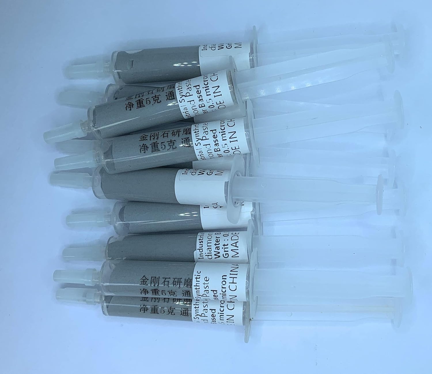 SIGNI 5 gram Diamond Polishing Lapping Paste Compound Syringes Includes: 1.0 Micron, 10 pcs The Detail Micron application as following : ▲0.5 Micron - Final Polish ▲1.0 Micron - Mirror finish ▲1.5 Micron - Mirror finish ▲3.0 Micron - Fine Polish ▲5.0 Micron - Fine Polish ▲7.0 Micron - Pre Polish, fine lapping ▲9.0 Micron - Lapping ▲14 Micron - Stock Removal or lapping metals ▲20 Micron - Stock Removal or lapping metals ▲28 Micron - Medium fast lapping ▲40 Micron - Fast lapping or stock removal carbide Notice: ➤This is 7% concentration,for more concentrated diamond pastes: 30% concentration compound is ASIN B07TSFDDYH. ➤For all polishing and lapidary purposes, designed to resolve all and any task. ➤Use it on jewelry & gemstone, steel & hard metal, aluminium & zinc, all metallurgical purposes. Water based and easy to clean.